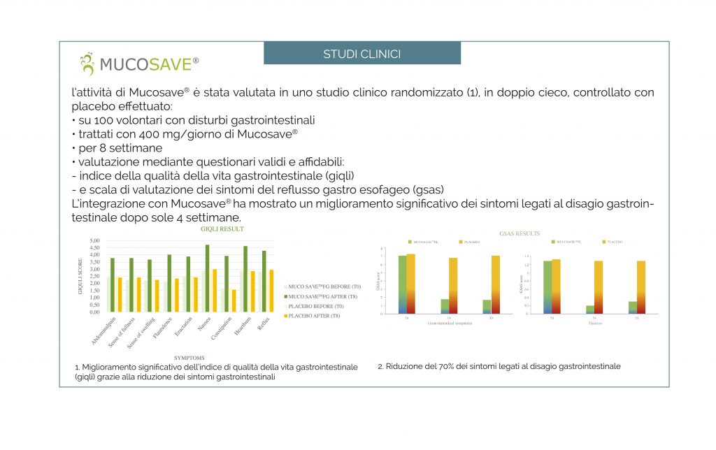 Il REFLUSAVE è un integratore alimentare formulato con Mucosave®, acido ialuronico ed estratto glicerico di Malva, mirato a proteggere la salute gastrica. La sua integrazione, aiuta a contrastarne i disturbi gastrointestinali più comuni come il bruciore di stomaco e i sintomi legati al reflusso gastroesofageo, sfruttando la combinata azione emolliente e lenitiva dei suoi ingredienti. Il MUCOSAVETMFG ha mostrato un miglioramento significativo dei sintomi gastrointestinali, dopo sole 4 settimane. Gli estratti naturali di Fico d’India e Olivo di cui si costituisce, hanno un’azione mirata sulle mucose più sensibili, combinando la forte capacità mucoadesiva dei polisaccaridi dell’Opuntia e l’effetto lenitivo dei biofenoli dell’Olivo. L’acido ialuronico e la Malva promuovono insieme la salute gastrointestinale, e allo stesso tempo supportarono la salute e il benessere della gola, grazie all’azione emolliente e lenitiva della mucosa orofaringea.